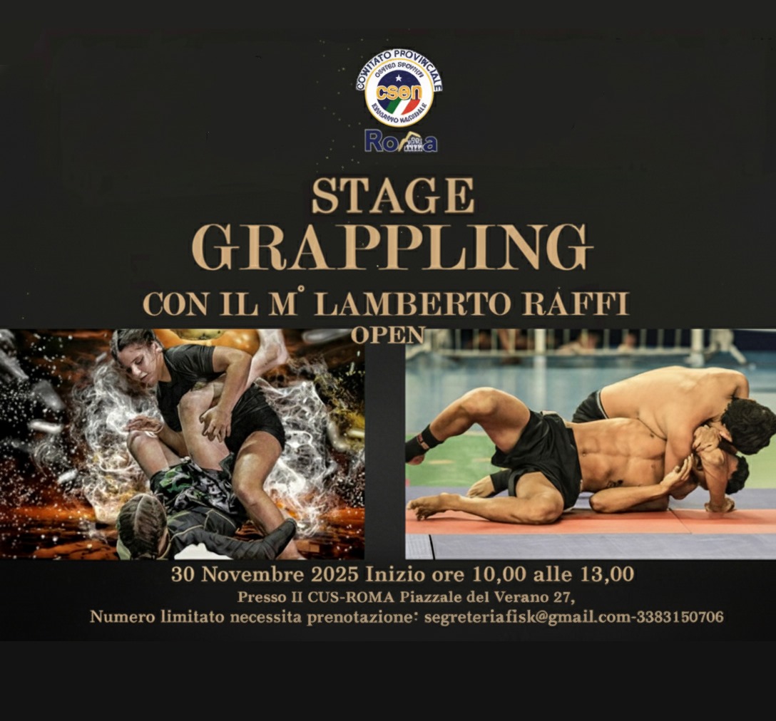 DOMENICA 30 NOVEMBRE 2025 PRESSO IL “CUS-ROMA CENTRO SPORTIVO UNIVERSITARIO” ROMA-PIAZZALE DEL VERANO 27, SI SVOGERA’ UNO STAGE DI GRAPPLING CON IL DTN. M° DTN. M° LAMBERTO RAFFI.