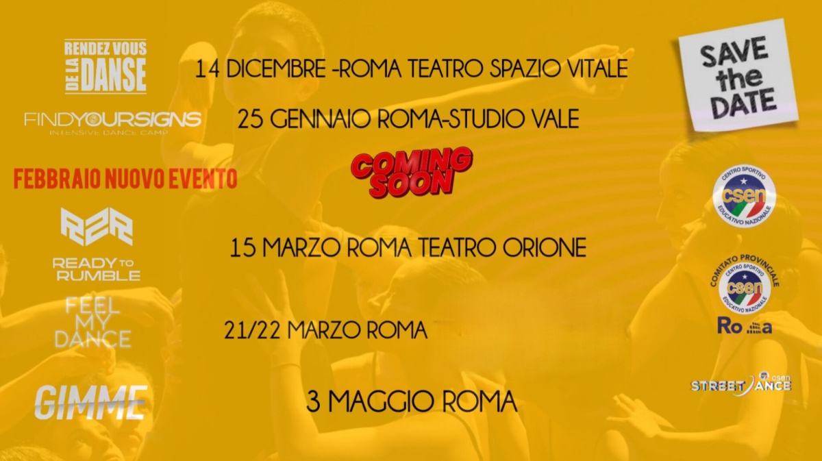 Con un ricco calendario di eventi, il Settore Danza Csen Roma propone ogni anno rassegne, concorsi e gare per tutti i livelli e tutte le discipline che raccoglie sotto di sè, con appuntamenti ormai garanzia di qualità e partecipazione.